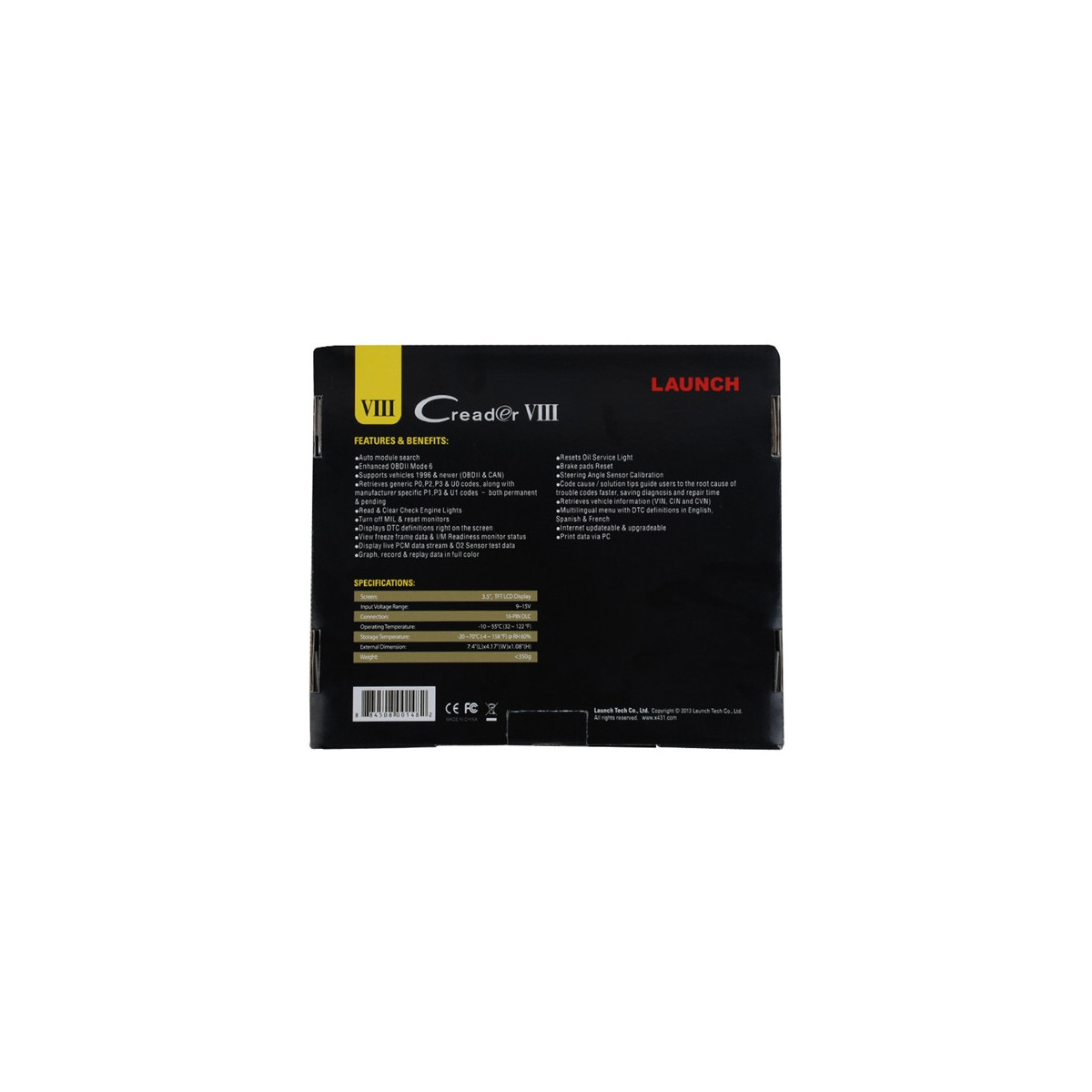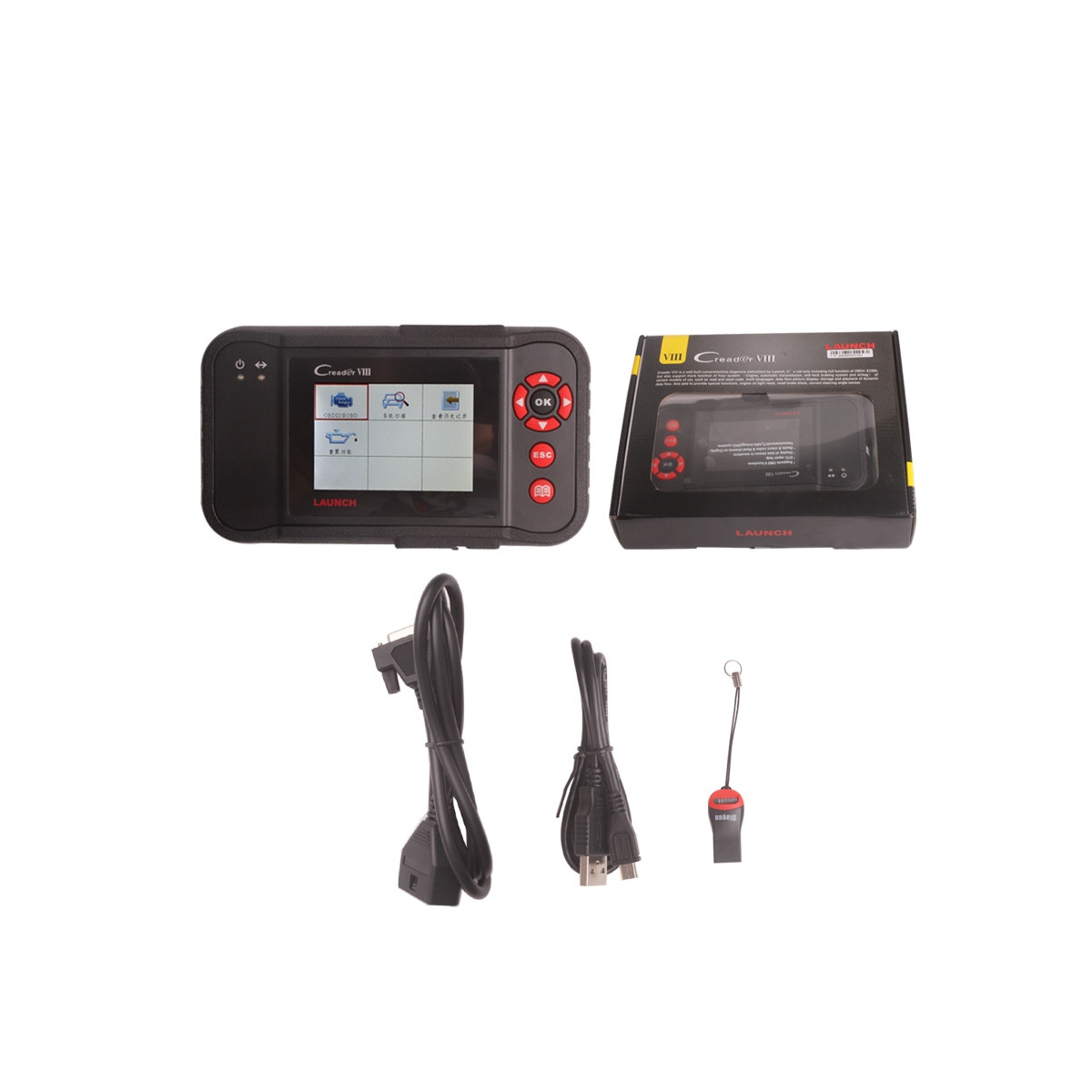 Launch Creader VIII je prenosná diagnostika vhodná pre malé servisy či domácich majstrov s jednoduchou obsluhou. Zariadenie je vybavené farebným displejom. Pre svoju činnosť nepotrebuje laptop. Uložené v plastovom ochrannom púzdre. Súčasťou je microSD karta 1GB a USB čitačka pre microSD karty. Vstavané jazyky: Anglický, Španielsky, Francúzsky, Čínsky.