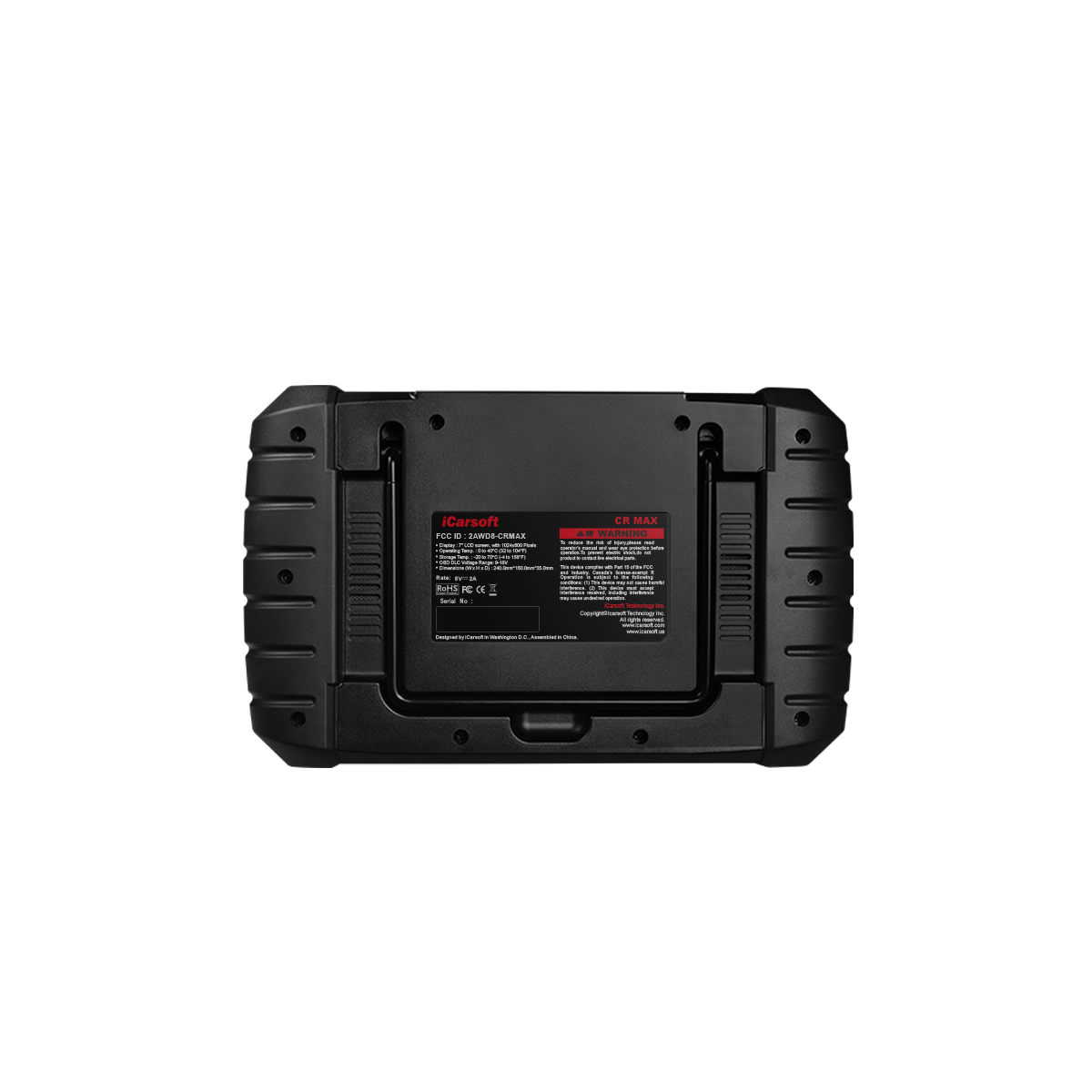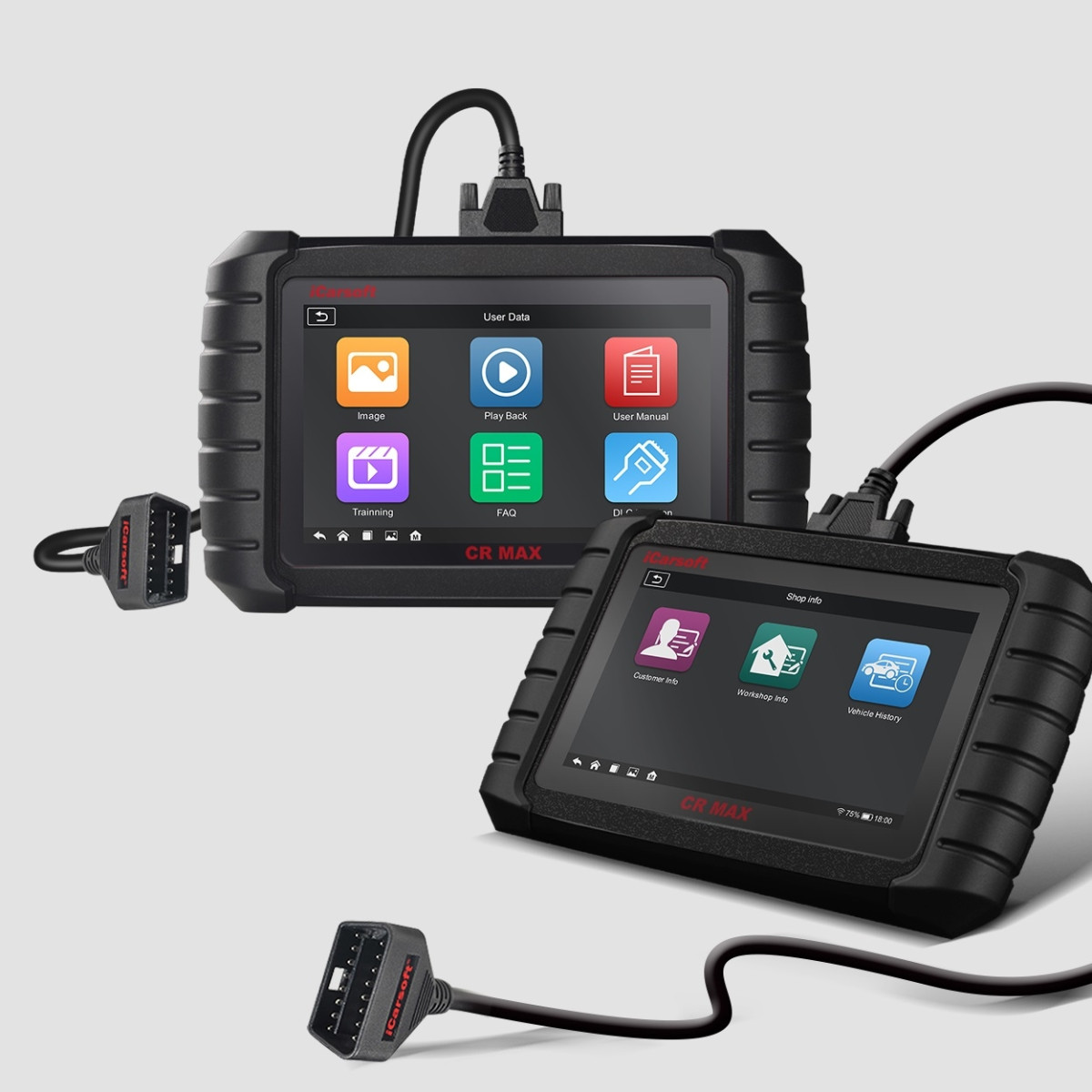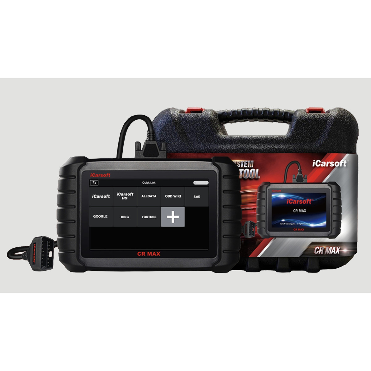 iCarsoft CR Max je prenosná profesionálna a výkonná auto diagnostika s jednoduchou obsluhou a podporou pre viac ako 40 výrobcov automobilov. Zariadenie je vybavené 7" farebným dotykovým kapacitným displejom s rozlíšením 1024x600px. Umožňuje rýchle čítanie a vymazanie poruchových kódov pre všetky dostupné moduly väčšiny výrobcov vozidiel dostupných na trhu. Podpora diagnostických protokolov vrátane CANBUS, ISO9141, KWP2000, J1850 a t.ď. umožňuje technikom presne diagnostikovať komplexné poruchy vozidiel. Pre svoju činnosť nepotrebuje laptop. Diagnostika je uložená v plastovom ochrannom púzdre a je napájaná vlastnou vstavanou batériou. Súčasťou je nabíjací adaptér, USB kábel a OBD kábel. Vstavané jazyky: Český, Anglický, Nemecký, Holandský, Španieksky, Francúzsky (ďalšie jazyky budú dostupné na stiahnutie cez internet).